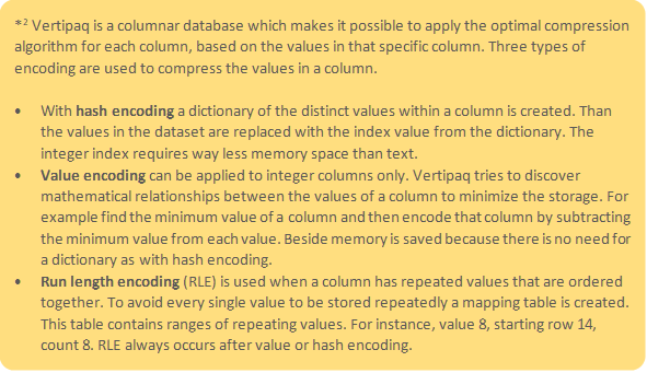 With an integer datatype value encoding may be enabled. This is why I converted the orders_ID column to an integer. I replaced the store (S) and webshop (W) indicator in the orders_ID with a number. Unfortunately what I expected did not happen. There was no change in dictionary size. Hash encoding is still applied to compress the column, because the orders_ID values fluctuate significantly within the range (81.000 to 9.999.990).