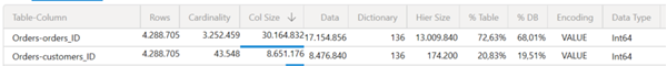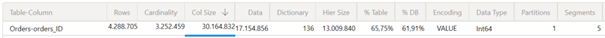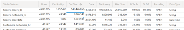 Since the orders_id column has the largest share in the size of the model this is the place to start optimizing. It is a string column with many distinct values. This means low compression. Vertipaq uses the hash algorithm *2 to store the data. Resulting in a large dictionary size (106 MB). This is being referred to as a high cardinality.