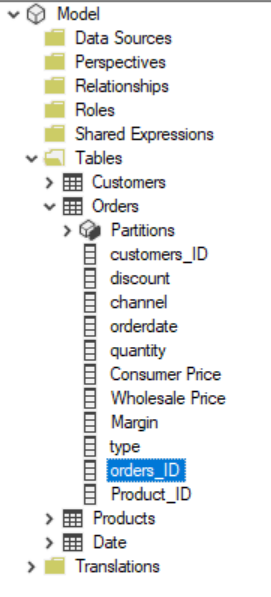 Another way to optimize your model is by looking at the size of the automatically generated hierarchy of a column (used by MDX). These hierarchies are used to improve the user experience in Excel and other client applications that use the MDX query language against tabular models and Power BI datasets. The size can be set to zero in Tabular Editor by changing the option available in MDX to false. After applying this option to the columns with the largest hierarchy size (orders_ID and customers_ID), the model size decreased to 28 MB.