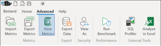 Within DAX Studio select View Metrics (Advanced tab) to perform the analysis (you have to be connected to a model (Home tab > Connect). The results will be discussed in the next section.