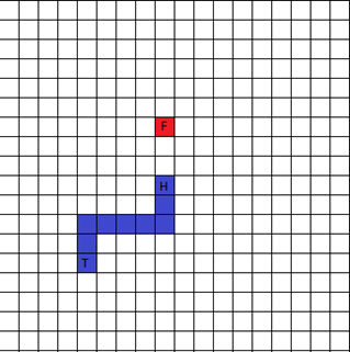 Our game environment can be defined as a grid of points, with a piece of food at a random coordinate in that grid. In our version of Snake there are no walls, which means that the only way the snake can die is by a collision into its own body. Our agent – the snake – is encoded by a list of coordinates that are covered by the snake, and the state is the current representation of the environment. The picture below shows an example of what the environment could look like. Where the F is food, H is the head of the snake and T is its tail.