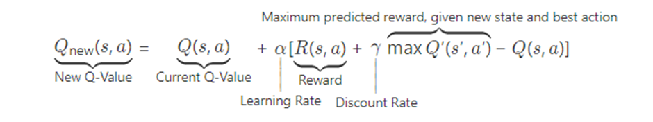 So, besides the Q function, the equation has parameter alpha as the learning rate of the algorithm that influences how fast the Q function is updated and therefore the rate at which the perception of the agent changes while learning her best actions. Reward function R shows the immediate reward of taking action a in state s. Discount rate gamma discounts future rewards that come after the immediate reward. This is necessary to reflect real life, in which a reward in the far future is most of the times deemed (slightly) less important than immediate reward. These hyperparameters alpha and gamma are set by the programmer before the algorithm is deployed.