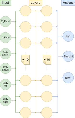 For this first version of the model, we insert fairly simple input features that consist of ‘which direction the food is’ and ‘if the snake’s body is near its head’, we do not want to overcomplicate our model. Therefore, we choose to build a neural network consisting of two layers with 16 neurons and end with a dense layer that forecasts the reward for each action. This neural network will then be used as our Q function.