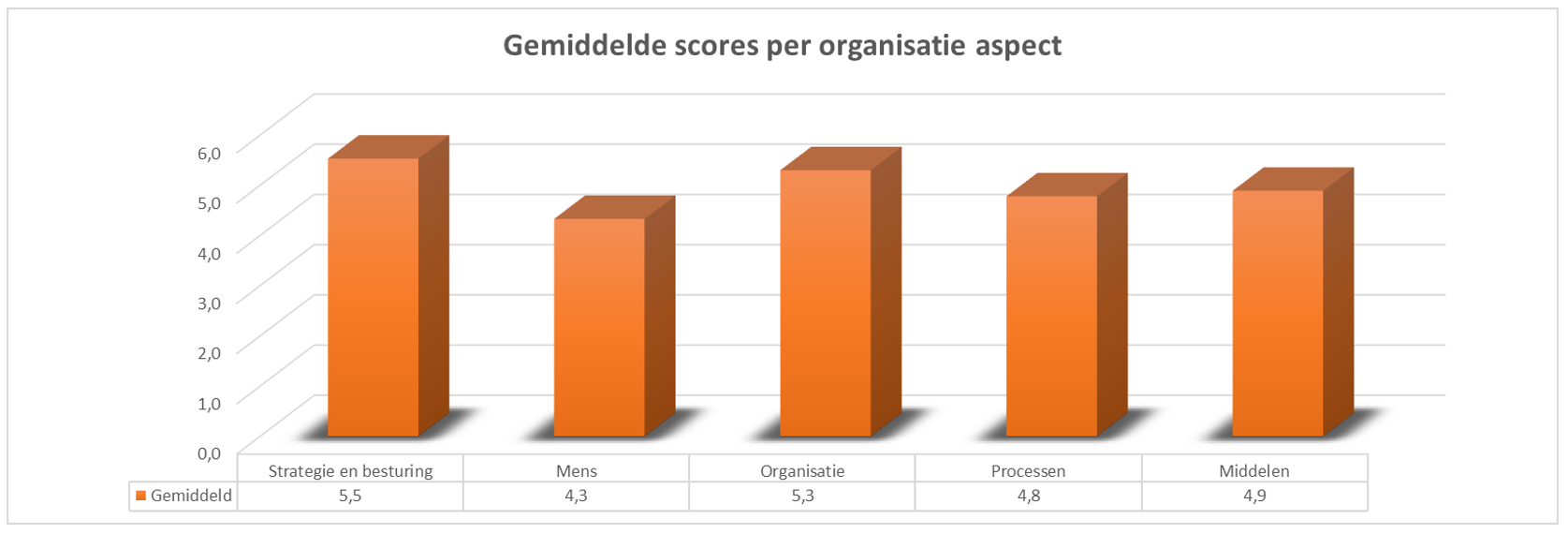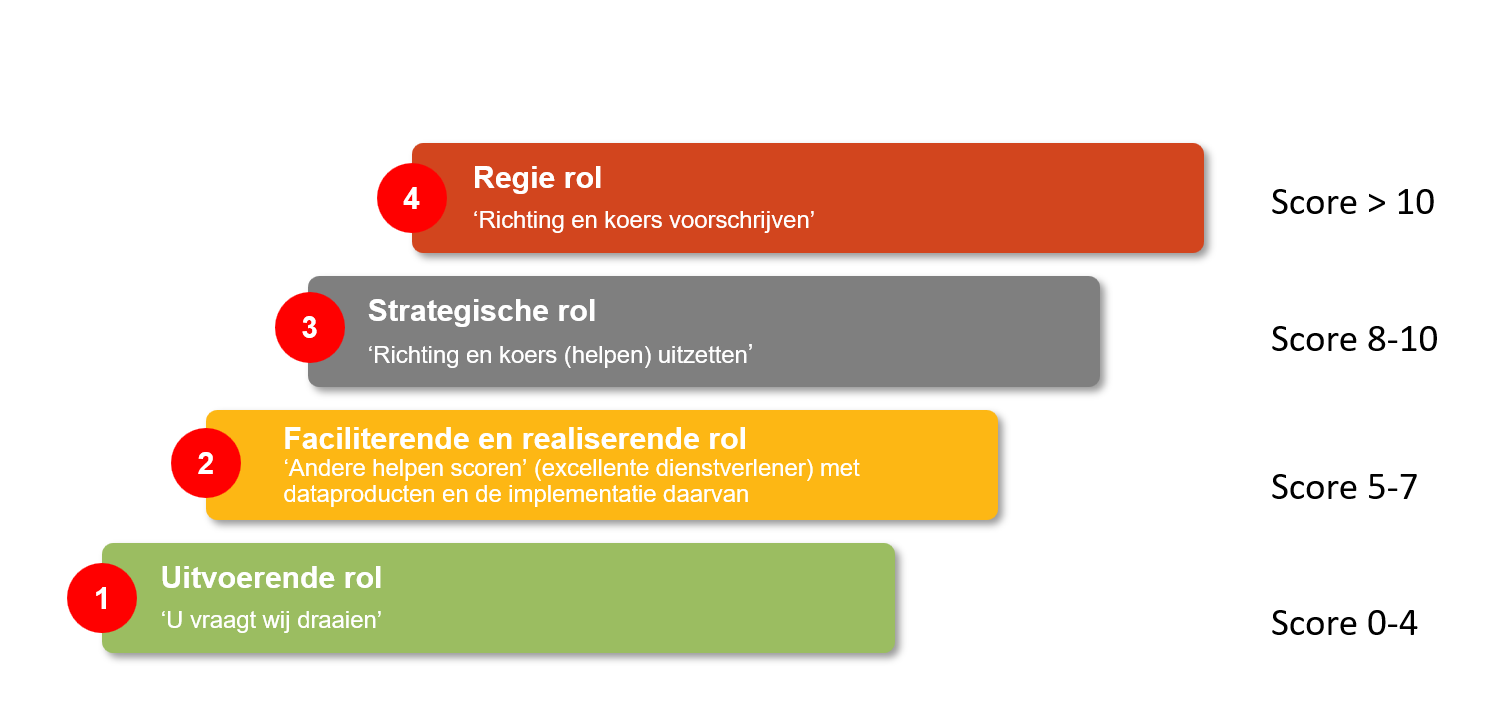 In totaal zien we scores rond de 4-5 (Maximale score: 12) per organisatie aspect. Dat wil zeggen dat de meeste organisaties inschatten dat ze in de overgang zitten van “een loket voor datavragen” naar “data als facilitor”: ondersteunend aan de doelstellingen van verschillende organisatieonderdelen. Opvallend: er zijn in ons onderzoek nog geen organisaties die inschatten dat data al volledig een strategische of nog hogere rol speelt.
