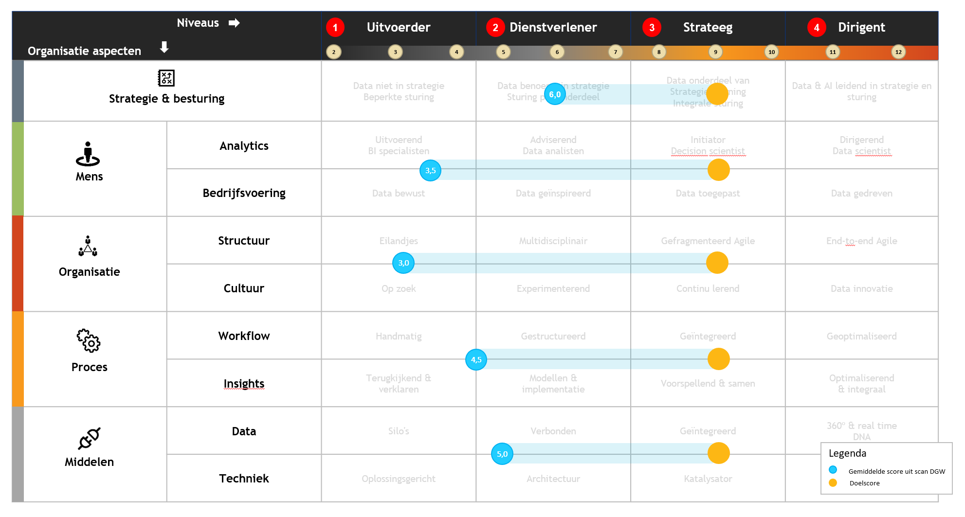 De uitkomsten van de scan datagedreven werken geven aan hoe volwassen je bent als organisatie en zijn te plotten op de deelgebieden. Ze geven daarmee de gaps aan naar het ambitieniveau.