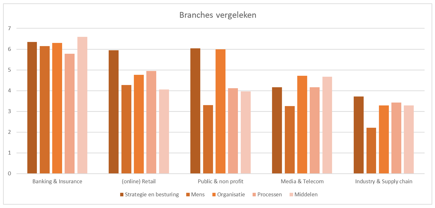 Wat we zien als we branches met elkaar vergelijken (overzicht is niet uitputtend) is dat de van oudsher data-intensieve branches gemiddeld hoger scoren. En dat de verschillende deelaspecten van datagedreven werken meer in balans scoren. We zien met name de financiële partijen (banken en verzekeraars) en daaropvolgend (online) retailpartijen en publieke dienstverleners hoger en meer in balans scoren. Industriële en logistieke partijen scoren in ons onderzoek het laagst en beoordelen zichzelf lager, vooral op de inzet van data voor innovatie.