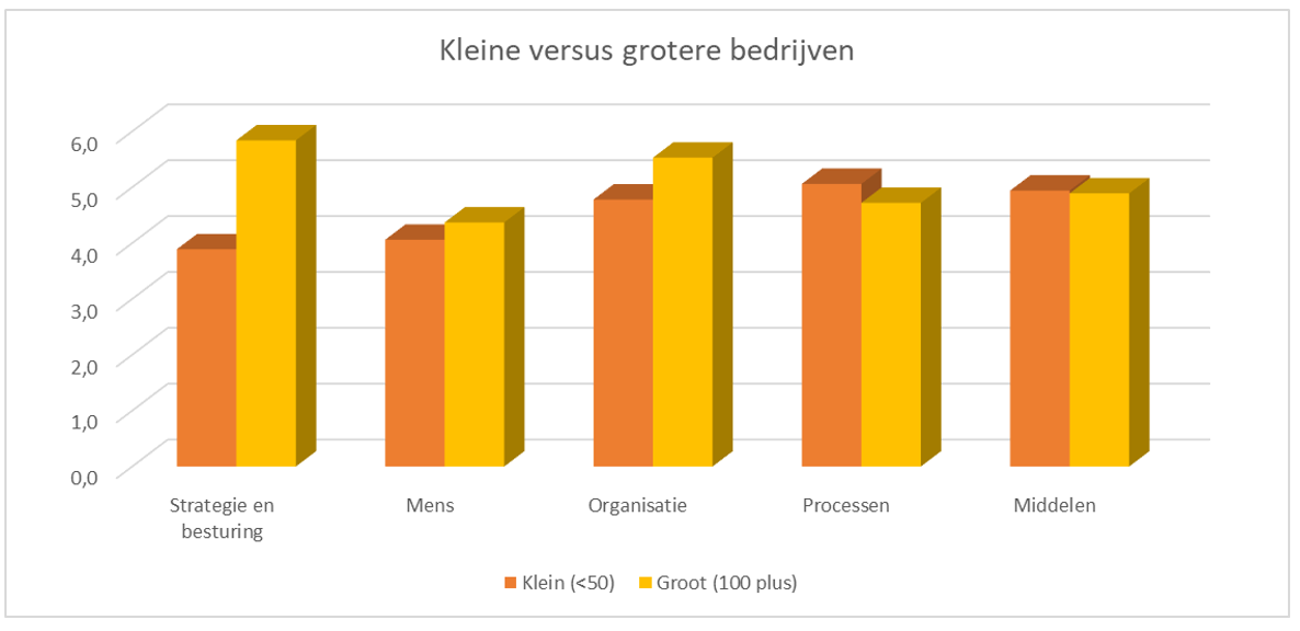 Bij grotere organisaties zien we juist dat ze hoger scoren op beleid en organisatie-inrichting maar relatief gezien meer worstelen met de meer praktische aspecten om het daadwerkelijk tot uitvoer te brengen. Niet zo gek ook als je bedenkt dat sommigen van onze opdrachtgevers een paar duizend mensen in beweging proberen te krijgen om de slag te maken naar een lerende organisatie. Op basis van data en feiten voor betere beslissingen. En met een legacy van complexe systemen en datastromen.