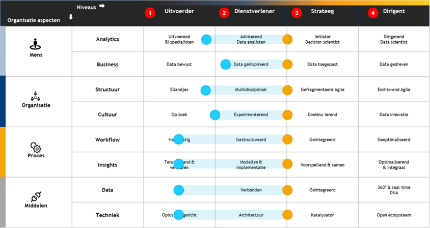 Naast mensen, processen en middelen vraagt dat van organisaties ook dat ze de juiste structuur en cultuur hebben om de verandering te laten werken. En data op strategisch niveau toe te passen.