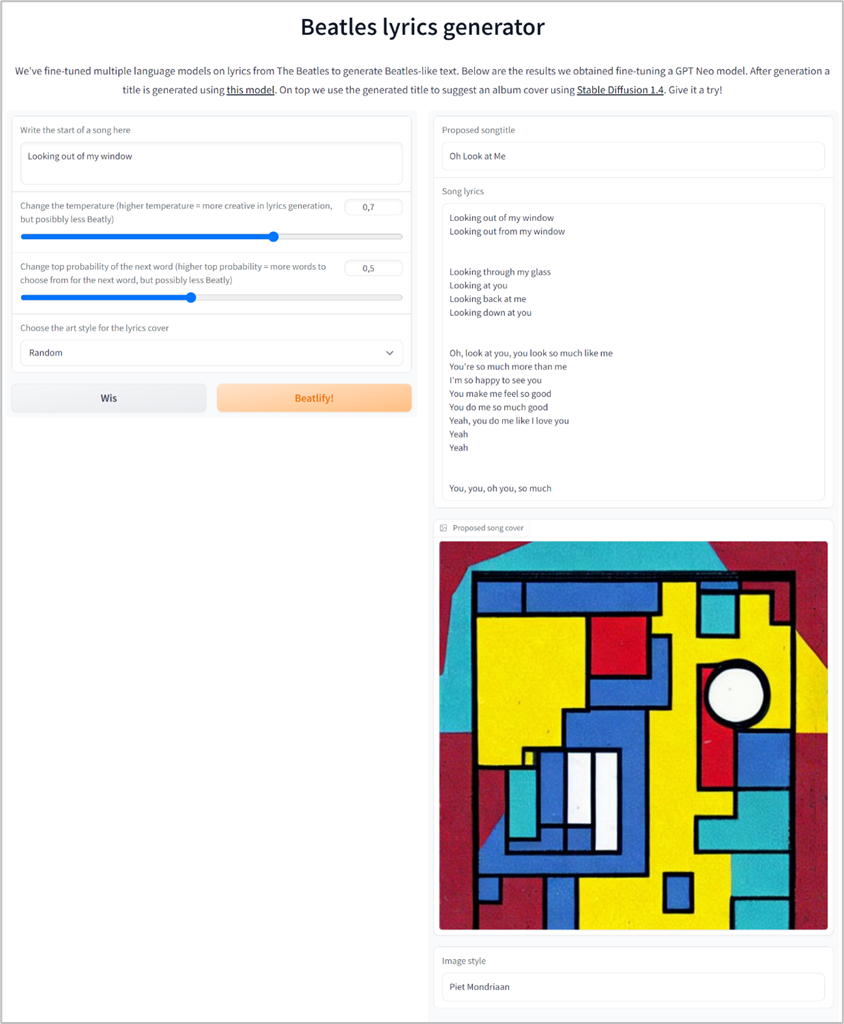 The function that is used is the function we made to generate the lyrics, title and cover. The inputs consist of the input prompt, some model parameters and a list to choose from for the style of the album cover. Lastly, the type of output is defined. That is all there is to it. Our Beatles lyrics demo can be found here, as well as the code to reproduce it.