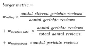 Met een gewogen combinatie van algemene en gerichte (i.e., men heeft de hamburger in de review benoemd) beoordelingen komen we een eind met een overall beste burger oordeel. Na de eerste iteratie zagen we dat dit toch nog geen bevredigend beeld gaf. Is de burger van een restaurant met een gemiddelde reviewrating van 4,6 sterren op basis van 100 gerichte reviews beter dan de burger van een restaurant met gemiddeld 4,5 sterren op basis van 700 gerichte reviews? Het aandeel van reviews per restaurant dat specifiek over hamburgers gaat geeft een indicatie dat de hamburger een belangrijk of populair gerecht is voor dat restaurant. Als we deze elementen combineren, komen we op de volgende formule uit: