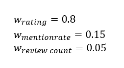 Waar de w staat voor het gewicht. Dat wil zeggen, hoe veel een variabele meetelt in de uiteindelijke score. De variabelen zijn (na deling) geschaald voor ze zijn gewogen en gesommeerd. Eigenlijk kun je dus zeggen dat de burger metric weergeeft hoeveel standaarddeviaties het restaurant boven of onder het gemiddelde zit. Waarbij het gemiddelde dan een gewogen combinatie is van het gemiddeld aantal sterren, het percentage gerichte reviews en het aantal gerichte reviews. De gewichten zijn als volgt gekozen:
