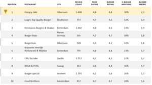 We hebben elk restaurant gesorteerd op de burger metric en zo een top 10 van Nederland samengesteld. Hungry Jake uit Hilversum scoort het best! In figuur 1 zie je welke restaurants nog meer een bestelling waard zijn en op basis van welke gegevens de burger metric is berekend.