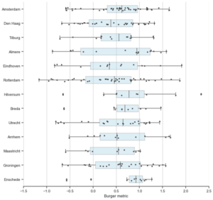 Benieuwd in welke stad je de beste burgers bestelt? Zie hieronder figuur 2 hoe de score van burger restaurants verspreid is per stad. Rotterdam kent de grootste spreiding. In Enschede zit je vrijwel altijd bovengemiddeld goed.