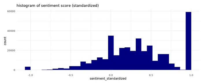 theme_minimal() +labs(title='histogram of sentiment score (standardized)')