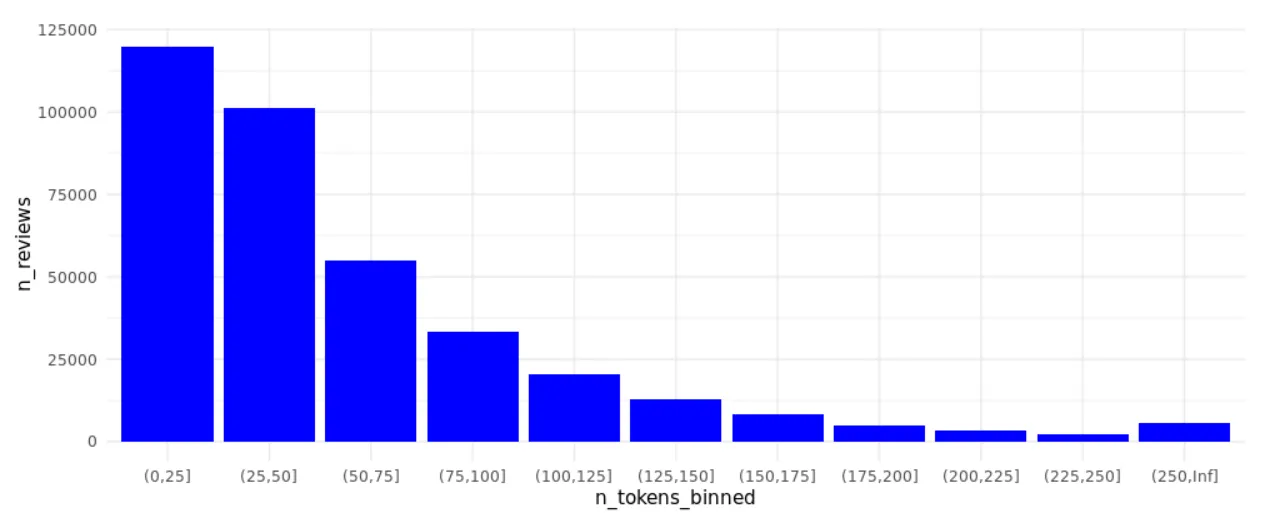 - We see several frequent review texts that only differ in punctuation. Here we make our next decision with possibly high impact on later analysis steps: We remove punctuation entirely from our data. Since we want to focus on total review texts in our analyses and not on the sentences within reviews, this is ok for us. For other analyses, this might not be the case!
