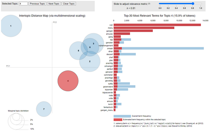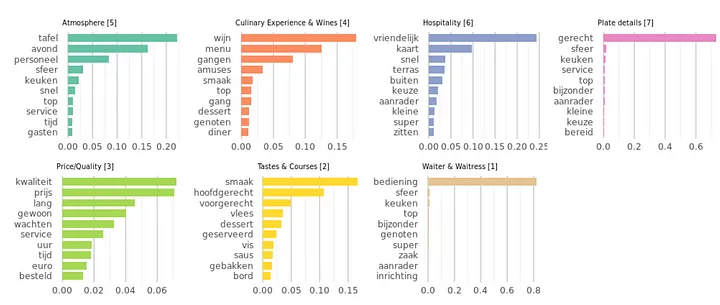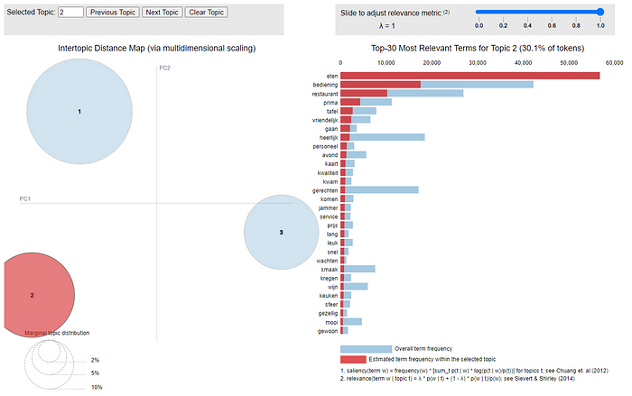 Iterating and comparing outcomes resulted in 7 topics we could label nicely with topic names of subjects that reviewers talk about when reviewing restaurants. Here’s our solution for the topics with the labels already added to them: