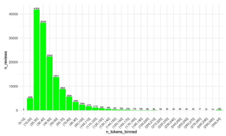 group_by(n_tokens_binned) %>% summarise(n_reviews = n()) %>%