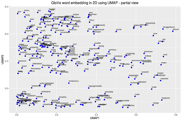 Let’s zoom in on the GloVe embedding some more an plot labels for all the embedding points. On the bottom left we clearly have a spot for desert related words (brownies, citroentaart ‘lemon cake’, spekkoek ‘layer cake’). On the top right we have things that went wrong (teruggestuurd ‘sent back’, lauw ‘lukewarm’, bevroren ‘frozen’) and on the middle left we have a spot for snacks (bitterballen ‘bitterballs’, mayonaise, kipnuggets, frikandellen ‘meat balls’). These embeddings clearly show that with this technique we are able to cluster words together that have the same semantic meaning.