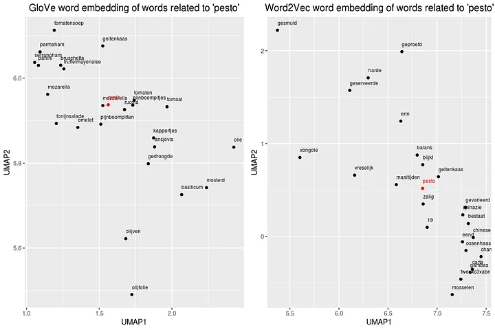 We can also take a single word from the index for both techniques and plot semantically close words to see differences between GloVe and Word2Vec. We choose for the word pesto as it has many ingredients, can be used in various dishes and not everybody likes the taste. First we gather words that are close (based on the L2 distance), save results in a dataframe and plot results. These plots are crystal clear, the GloVe model does a far better job in understand relationship between words in our restaurant reviews.