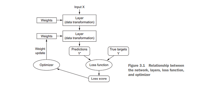 - Lastly, the network has a optimizer which determines how the network will be updated (the weights get a new value) based upon the value of the loss function.
