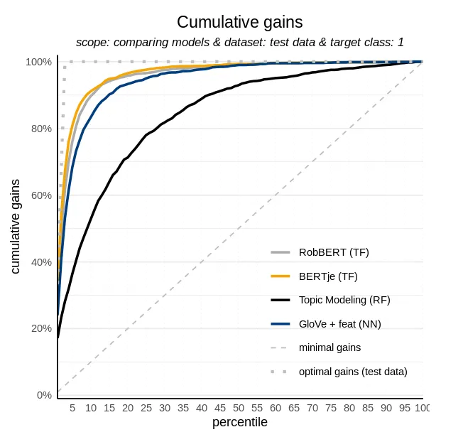 Looking at the values in the confusion matrix results for the RobBERT model look very much like the values we saw estimating the finetuned BERTje model. In the graph below, using modelplotr we can even see that the BERTje model outperforms the RobBERT model by a few percent. At the fifth ntile the RobBERT model has 76% of Michelin star restaurant reviews detected against 81% for the BERTje model.