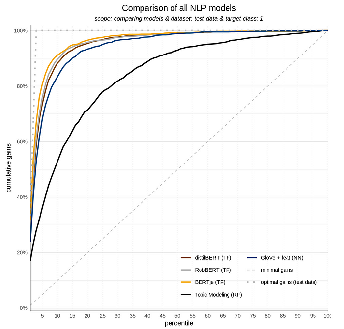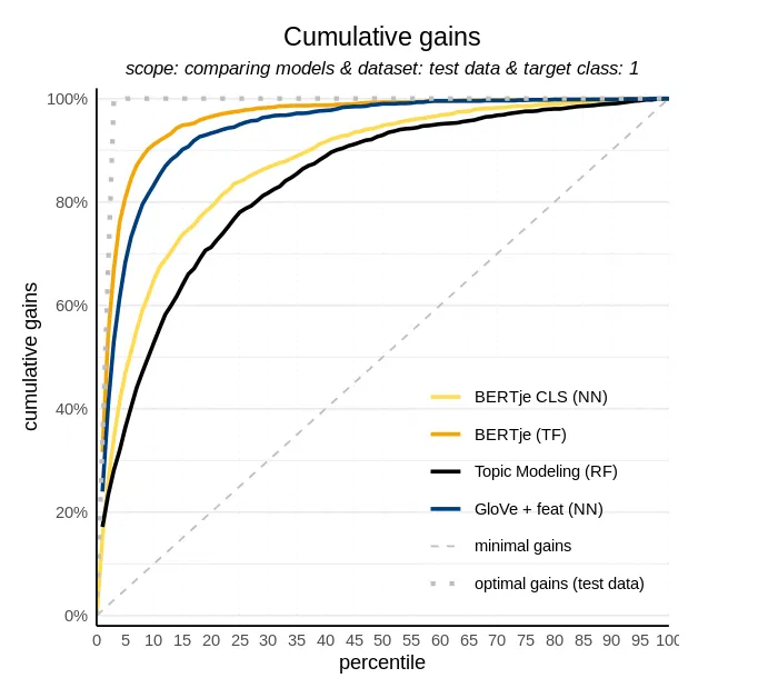 That is a quite impressive cumulative gains chart! The BERTje finetuned model outperforms our best word embedding model. After 5% of all cases the finetuned BERTje model retrieves nearly 81% of all reviews related to a Michelin star restaurant. Our best performing word embedding model detected 68% of those reviews at 5% of alle cases. Maybe we can do even better, let’s look at a competing transformer model to see if we further improve performance.